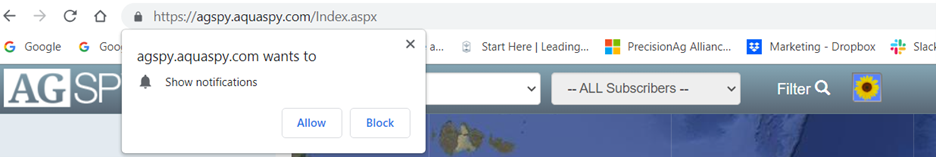 We have made enhancements to the alerts and notifications feature in AgSpy. To take advantage of this capability, please allow access to pop-ups (Notifications). This will allow your web browser to pass along notification data from this specific AgSpy URL.
